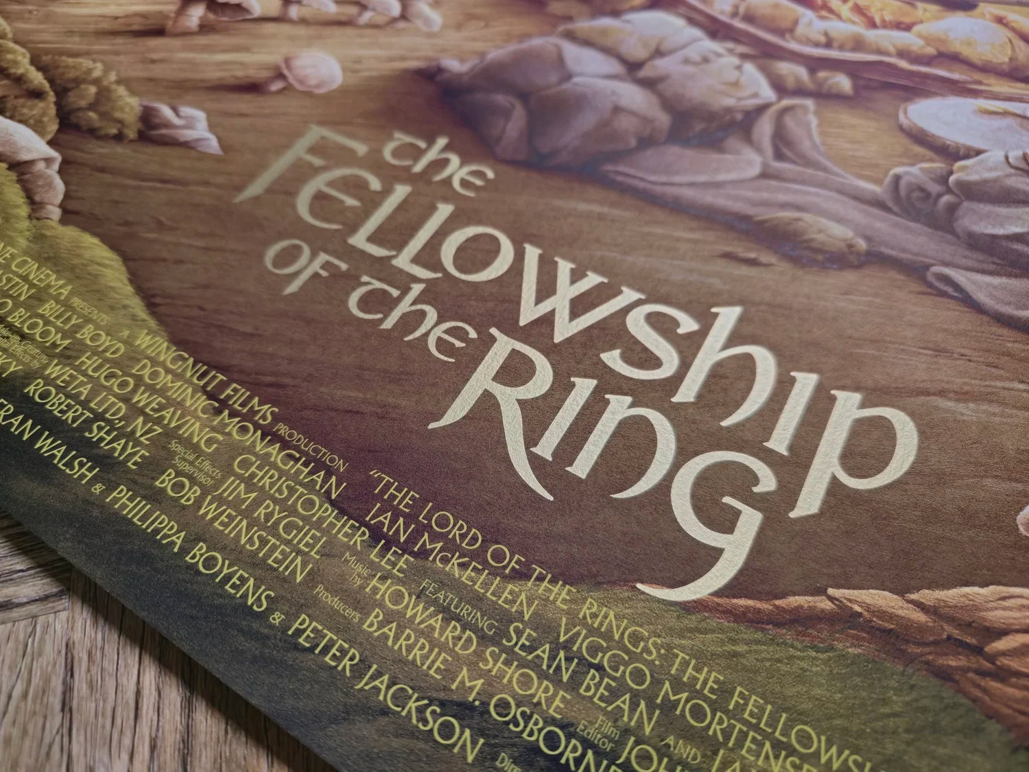 An official limited edition screenprint based off the 2001 movie Lord of the Rings: Fellowship of the Ring, directed by Peter Jackson and starring Elijah Wood, Ian McKellen, Viggo Mortensen, Sean Astin, Cate Blanchett, Orlando Bloom, Billy Boyd, Christopher Lee.