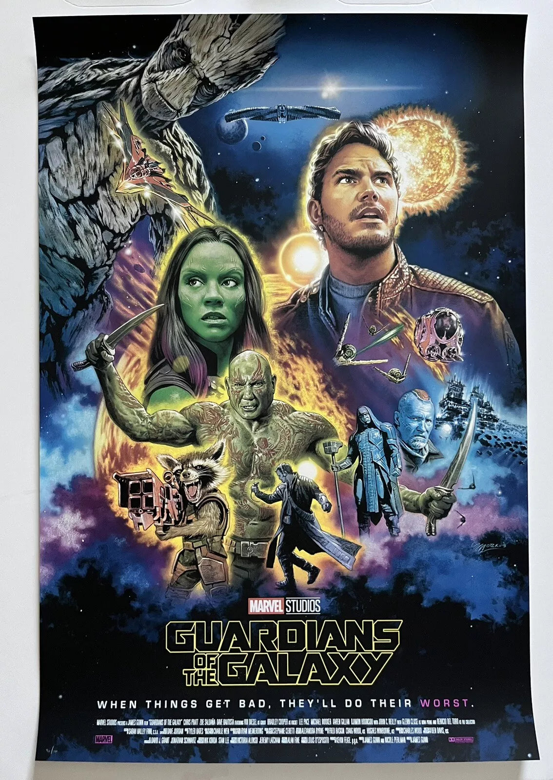 An official limited edition screenprint based off the 2014 movie Guardians of the Galaxy: , directed by James Gunn and starring Chris Pratt, Vin Diesel, Bradley Cooper, Zoe Saldana, Dave Bautista.