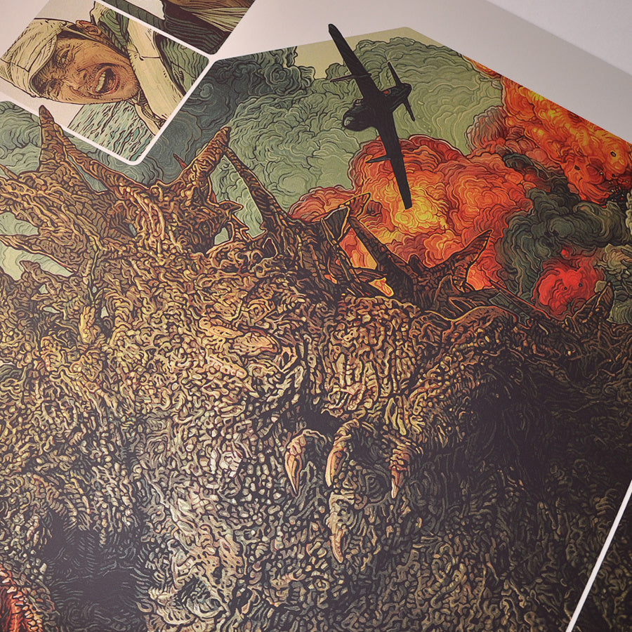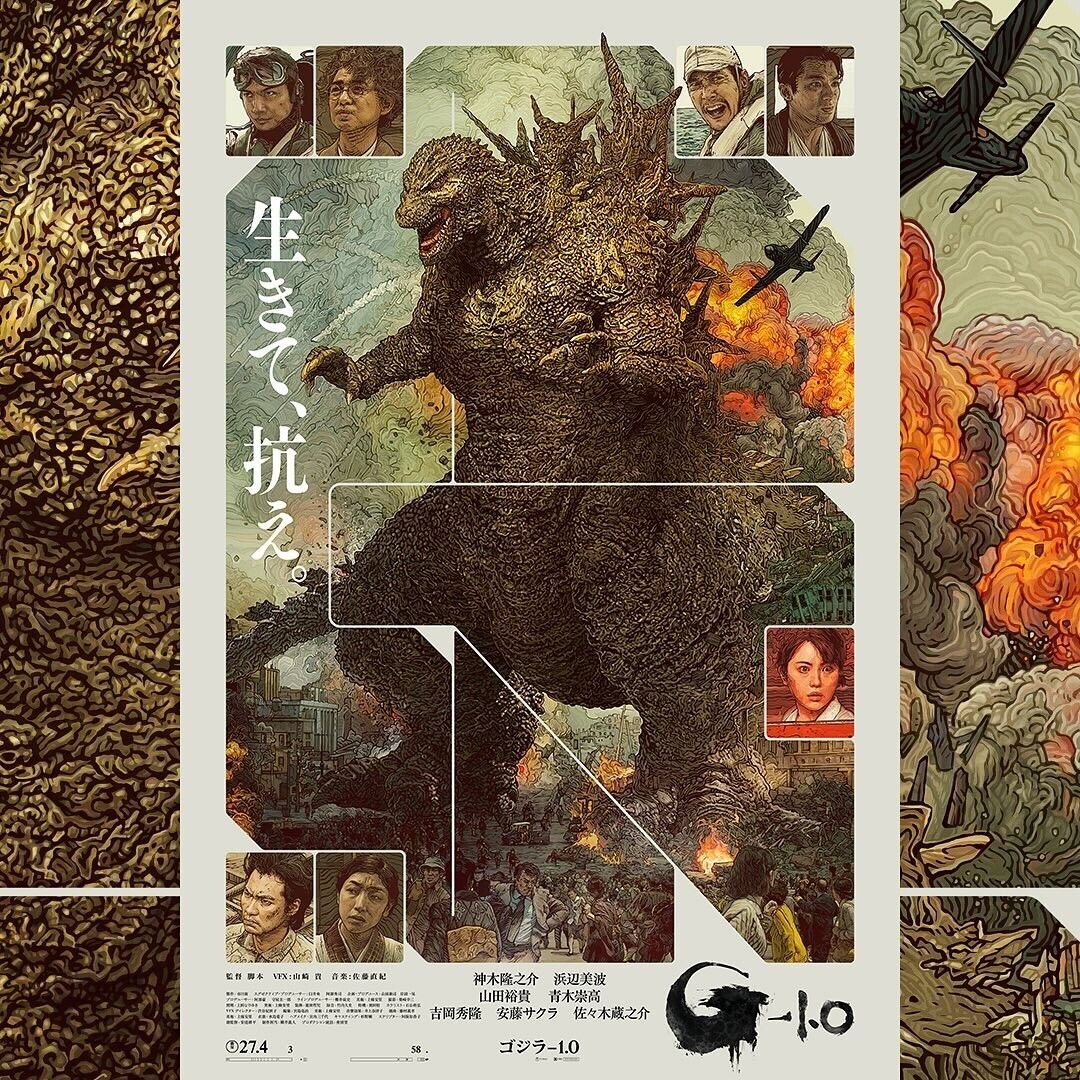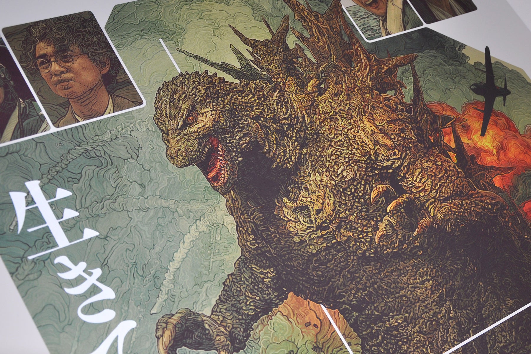 An official limited edition screenprint based off the 2023 movie Godzilla: Minus One, directed by Takashi Yamazaki and starring Minami Hamabe, Ryunosuke Kamiki, Sakura Andô, Munetaka Aoki.