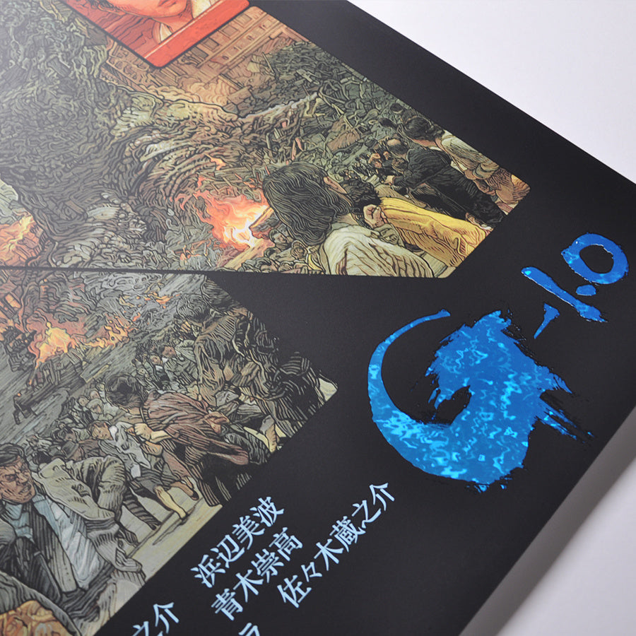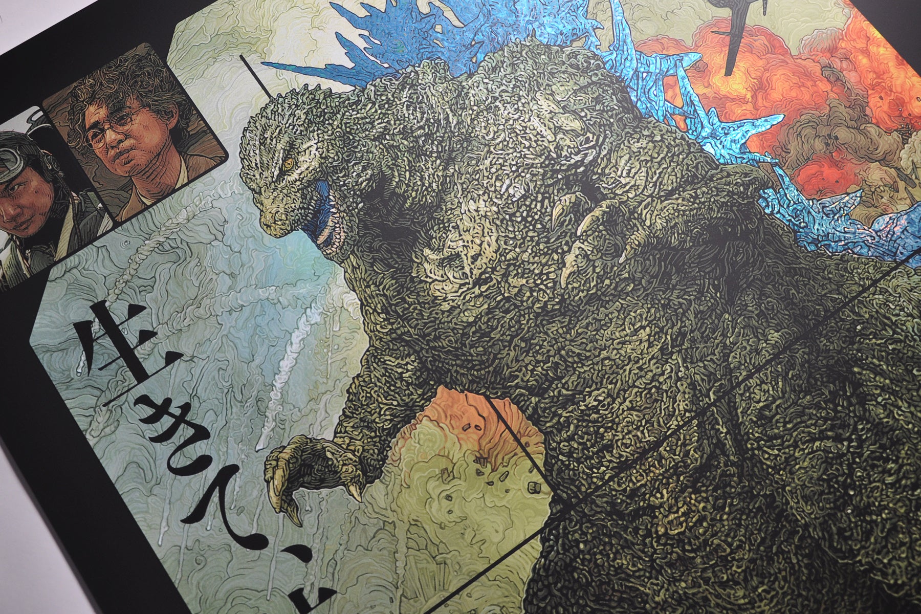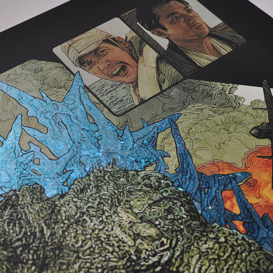 An official limited edition screenprint based off the 2023 movie Godzilla: Minus One, directed by Takashi Yamazaki and starring Minami Hamabe, Ryunosuke Kamiki, Sakura Andô, Munetaka Aoki.