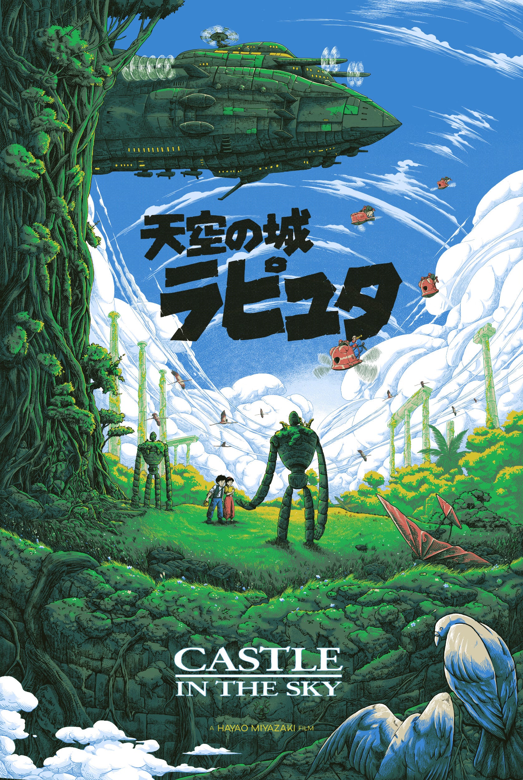 An official limited edition screenprint based off the 1986 movie Castle in the Sky: , directed by Hayao Miyazaki and starring Mayumi Tanaka, Keiko Yokozawa, Kotoe Hatsui, Minori Terada.